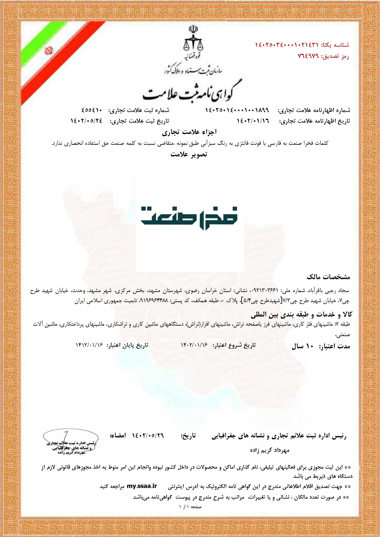 علامت تجاری شرکت فخراصنعت توسط اداره کل مالکیت صنعتی سازمان ثبت اسناد و املاک کشور ثبت شده و تحت حمایت قانونی است.